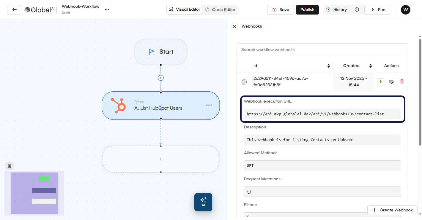This guide explains how to add and configure a webhook trigger for a workflow in GlobalAI. A webhook trigger creates a unique URL that can receive requests from external systems to start your workflow.