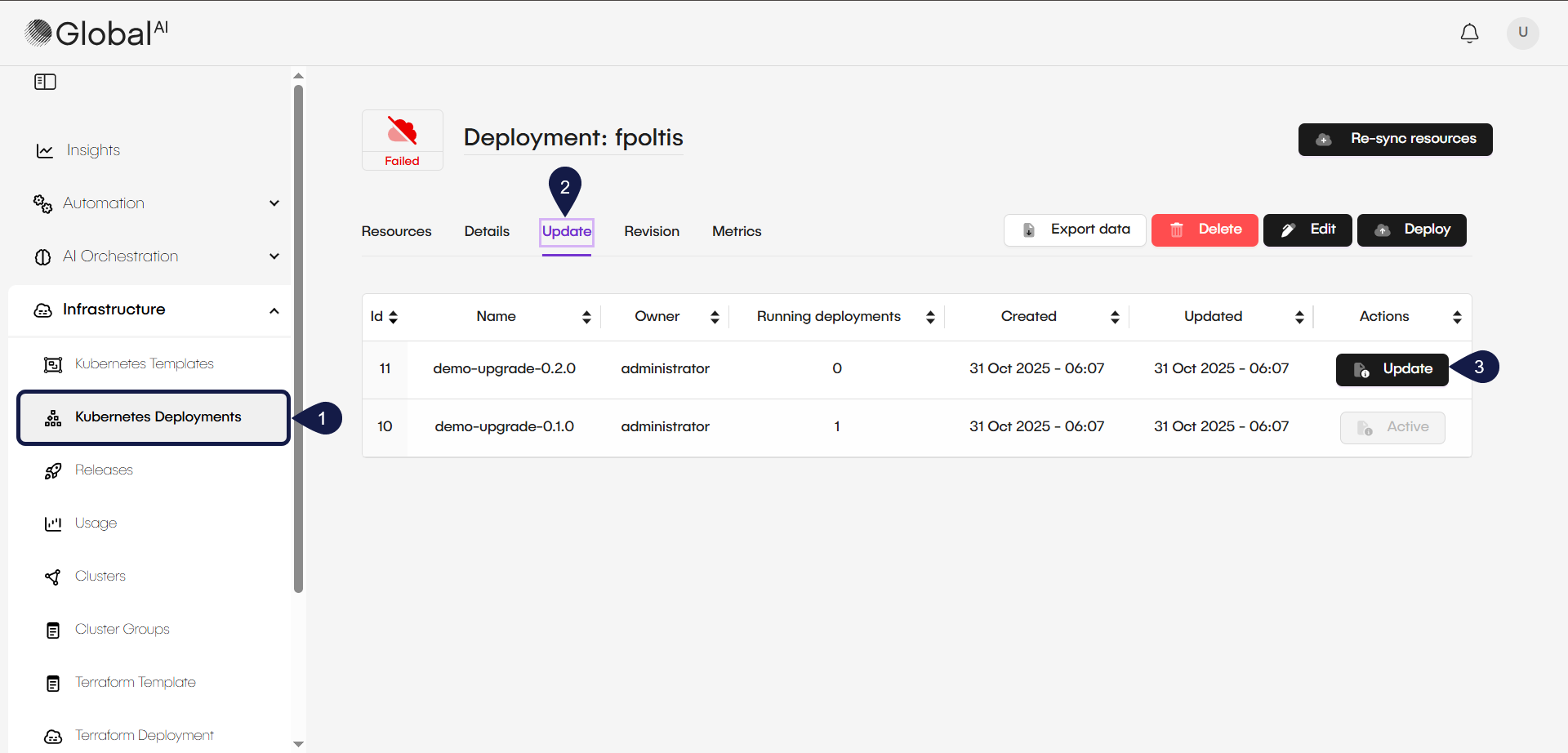 To maintain stability and consistency, GlobalAI allows you to update individual deployments or perform bulk upgrades across your entire infrastructure. You can manage configuration changes, view differences between versions, and ensure all customer environments stay current with the latest template improvements.