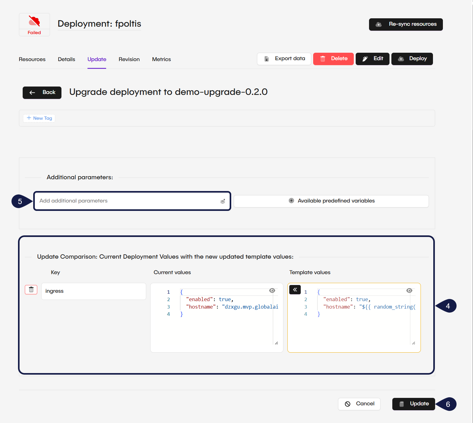 - Review the Differences. The platform walks you through a comparison process to show the difference between current deployment values and the new template version values.